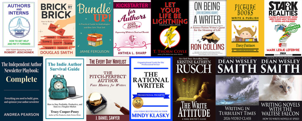Then we have the practical matters. Anthea L. Sharp’s brand-new edition of Kickstarter for Authors will help writers do early promotion on books and get paid to do so. Andrea Pearson’s The Independent Author Newsletter Playbook gives practical advice on how to build a newsletter that will support your writing career. Mindy Klasky’s The Rational Writer contains 52 promotional prompts so that you have ideas on promotion even when the well seems dry. And the updated version of Robert Jeschonek’s Authors and Interns will help you find assistance so that you can do all the things you discover inside of this bundle.